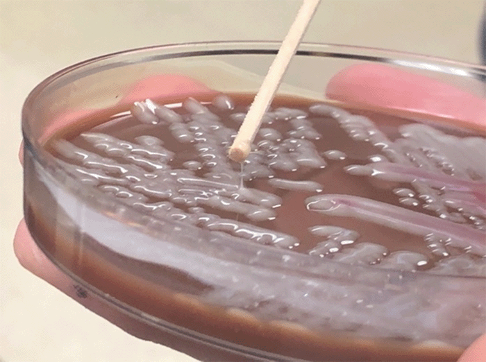 The string test evaluates formation of viscous "string" of greater than 0.5 cm in length elicited by stretching colony material using inoculation loop. A positive string test defines hypermucoviscous phenotype of Klebsiella pneumoniae.