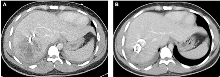 A) Transverse section of CT chest/abdomen/pelvis obtained two days after radiologic-guided drain placement demonstrating 7.6 cm × 6.5 cm complex collection in right hepatic lobe with pigtail percutaneous drain along medial aspect of collection; B) transverse section of CT chest/abdomen/pelvis from obtained 26 days after initial drain placement, demonstrating near resolution of intrahepatic fluid collection