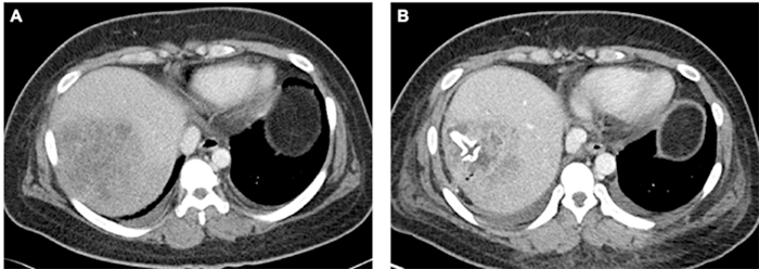 A) Transverse section of CT chest/abdomen/pelvis from Case 1 obtained 9 days after admission and 2 days before surgery demonstrating 8.9 cm × 8.0 cm × 7.8 cm heterogenous, complex collection in right hepatic lobe; B) transverse section of CT chest/abdomen/pelvis from Case 1 obtained 7 days after surgery with contrast demonstrating slight decrease in size of right hepatic abscess, measuring 8.0 cm × 5.0 cm × 7.0 cm. Drainage catheter with intrahepatic tip is visualized