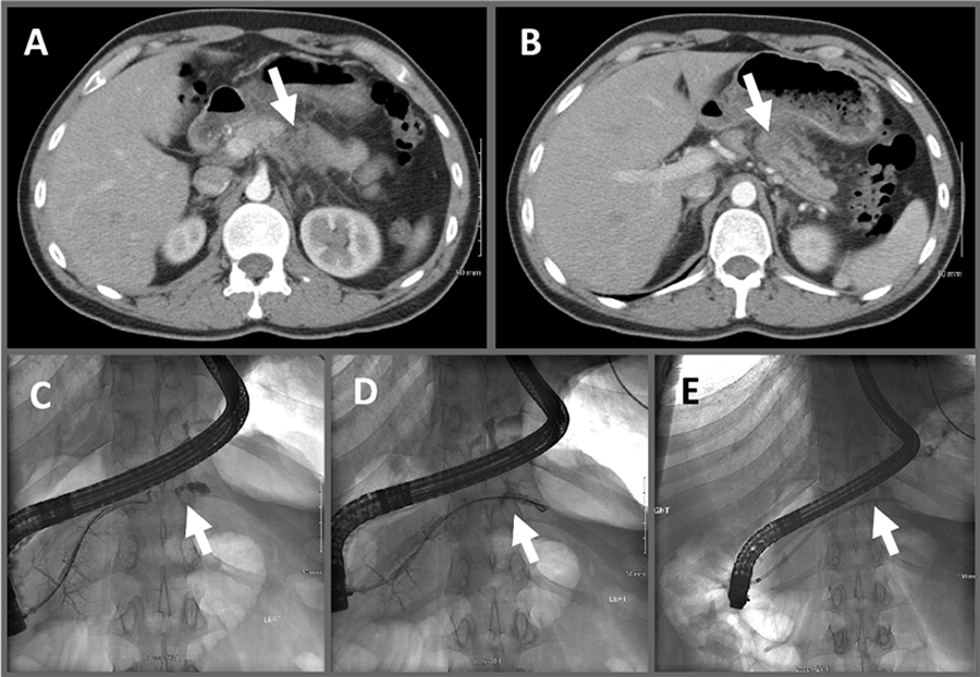 The patient is a 30-year-old male 1.5-pack-per-day smoker who suffered mild epigastric trauma while wrestling with co-workers, after which he developed progressive abdominal pain and clinical pancreatitis. A CT scan of the abdomen showed inflammation surrounding the body of the pancreas and a 1.6 cm low attenuation area with associated upstream pancreatic duct (PD) dilation (Figure 1A and Figure 1B). Given the history of trauma in a young patient, this abnormality was suspected to represent a site of PD disruption. The patient underwent ERCP showing PD disruption with contrast extravasation at this site, which was crossed with a wire and stented (Figures 1C‒1E) with a resolution of his pain.