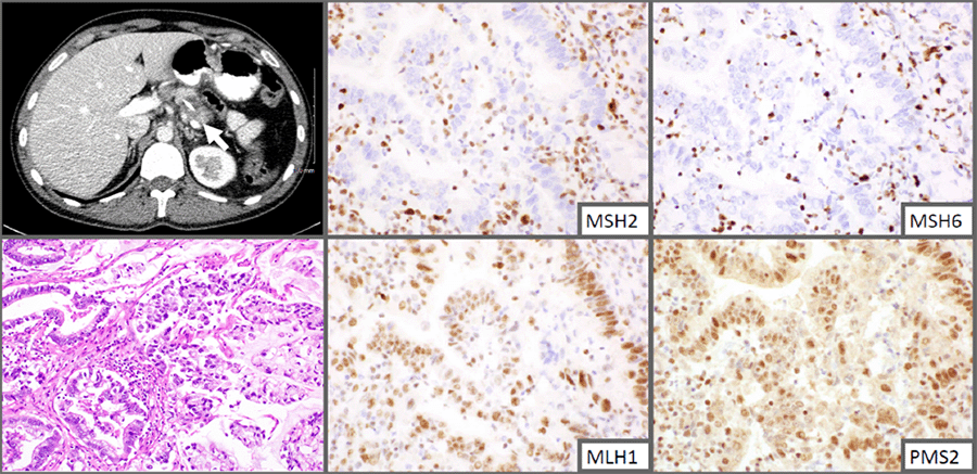 Interestingly, our patient's tumor showed MMR-d with loss of nuclear MSH2 and MSH6 expression by IHC as well as microsatellite instability (MSI-H), which are typical of Lynch syndrome (LS).33,34 By age 70, 3.7% of LS patients will develop PDAC, compared to 1.5% for the general population.34 In our patient, however, germline analysis did not identify any hereditary cancer syndrome, and further molecular analysis of the tumor did not find double somatic mutations to explain the loss of MSH2 and MSH6 in the tumor. We did find a somatic MLH1 mutation, although this is not associated with loss of MSH2 and MSH6 by IHC. The literature varies on the exact proportion of MMR-d/MSI-H PDAC, but in several recent large series with modern detection techniques, 1 to 2% of all PDAC were found to have this phenotype.35 This is more often seen in medullary and acinar cell carcinomas of the pancreas,35 while our patient showed signet-ring cell and mucinous features with areas of ductal differentiation. There is debate35 on the proportion of MMR-d PDAC arising from germline mutations (i.e., LS), ranging from all (7 of 7 MMR-d)36 to none (0 of 4)37 and varies depending on the patient population tested and detection methods. Overall, while multiple mechanisms to achieve an MMR-d/MSI-H PDAC exist, the common phenotype result is a high mutational burden, postulated to lead to increased neoantigen presentation to infiltrating cytotoxic T cells.35 Checkpoint inhibition (immune therapy) is increasingly being utilized in MSI-H cancers, including PDAC,38‒45 with proof of principle seen in a recent study in which the cohort of eight PDACs receiving pembrolizumab had two complete responses, three partial responses, and one with stable disease.