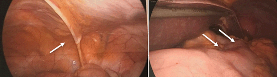 Figure 3. Images From Staging Laparoscopy Demonstrate Peritoneal Carcinomatosis and Linitis Plastica. Published With Permission