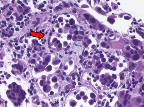 A) Area of gastric adenocarcinoma with signet ring morphology (representative signet ring cell indicated by arrow) adjacent to benign gastric epithelium—hematoxylin & eosin stain (200x); B) Gastric adenocarcinoma with multiple foci of lymphovascular invasion (red arrow)—hematoxylin & eosin stain (400x)