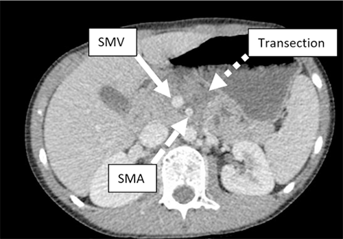 Transection (dotted arrow) can be viewed close to portal vein (solid arrow) and superior mesenteric artery (dashed arrow).