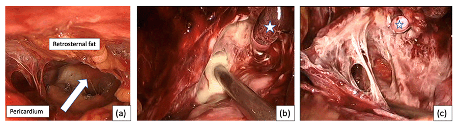 A) Initial view of the mediastinum through subxiphoid port (note absence of pus; arrow represents retrosternal tunnel); B) view of superior mediastinum (note pus drainage and cervical drain); and C) view post drainage with cervical drain (star represents cervical drainage tube).