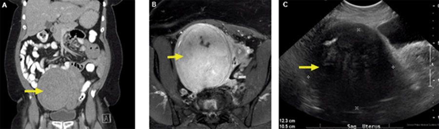 A) Axial abdominal CT scan; B) axial T2-weighted MRI; and C) transvaginal ultrasound.