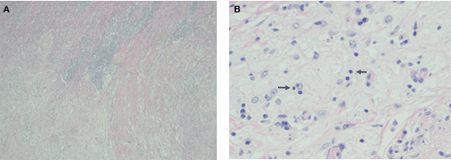 Low-power shows lymphocytic and histiocytic infiltrates and fibrosis; A) high-power shows scattered emperipolesis; and B) high-power shows scattered emperipolesis: histiocytes with phagocytosed small lymphocytes in cytoplasm (arrows).