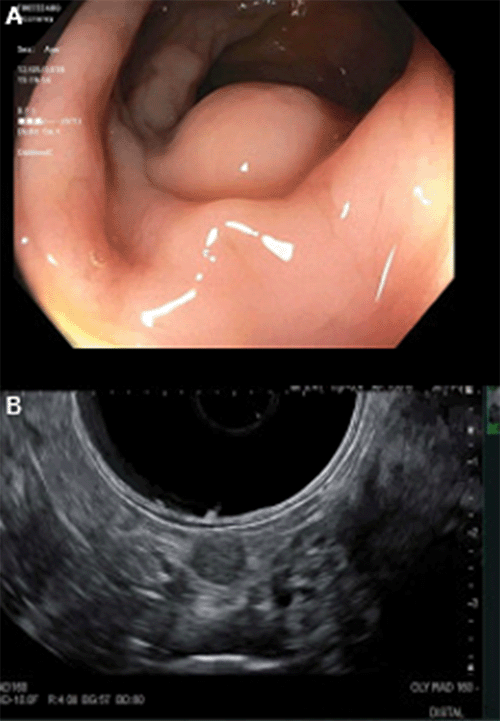 A) Colonoscopy with evidence of endoluminal protrusion of sigmoid mass; and B) endoscopic ultrasound highlighting abnormal perirectal lymphadenopathy.