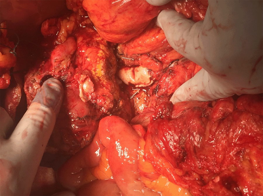 After induction of anesthesia, the patient was prepped and draped in the usual sterile fashion. A midline incision from the xiphoid to the pubic tubercle was performed. The falciform ligament and left triangular ligament of the liver were taken down; next, a Cattel–Braasch maneuver was performed to mobilize the colon and the small bowel. The lesser sac was opened using an energy device, and the distal stomach was stapled off because the pancreas was fused to it. Once the pancreas was identified, we traveled along its inferior border, tied off the splenic vein, and identified the superior mesenteric vein (SMV) and portal vein confluence. The anterior wall of the portal vein was almost entirely fused to the aneurysm, and we were unable to create an appropriate retro-pancreatic tunnel. The hepatic artery was ligated, as well as the common bile duct, to gain access and control over the PV. The gastroduodenal artery was identified and preserved. Once proximal and distal control was obtained, an anterior longitudinal cut into the aneurysm sac was made, the anterior wall was removed, and a large burden of clot was evacuated. At this point, we discovered that the anterior wall of the PV was almost entirely compromised. We decided to use a piece of 15 × 20 cm bovine pericardium as a conduit. We tabularized it with 6-0 Prolene stitches in a running fashion. Proximal and distal control was obtained, and the graft was sewed end-to-end in a single layer running fashion to the SMV on the proximal side and the portal vein stump in the same style on the distal side. Once this was completed, we reperfused and ensured we had good graft flow with Doppler. We desufflated the endovascular balloon but encountered bleeding at the celiac origin. Because the pseudoaneurysm created a significant mass effect distorting the patient's abdominal anatomy significantly, we decided to leave the endovascular balloon insufflated at the celiac trunk origin. We opted to pack the abdominal cavity, leave the abdomen open and transfer the patient to the intensive care unit where he could be resuscitated to take him back to the OR for a second look laparotomy and reconnect the gastrointestinal tract when hemodynamically stable. Before exiting the operating room, a cholecystectomy was performed. The patient was transferred to the intensive care unit, where he was resuscitated and remained intubated.