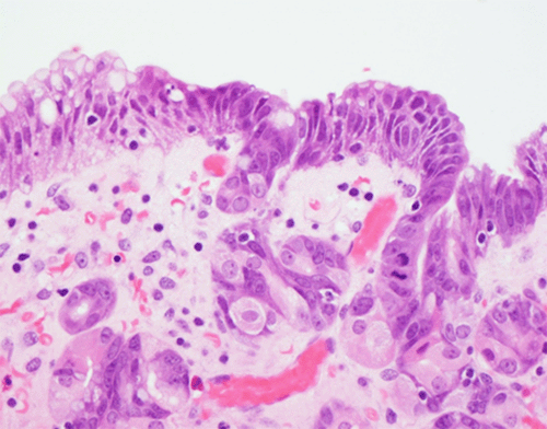 Figure 4. Hyperplastic Aberrant Pits (Proliferation of the Foveolar Pits, Resulting in Foveolar Pit Crowding) and Surface Epithelium With High-Grade Dysplasia, Demonstrating Full-Thickness Nuclear Stratification With Loss of Nuclear Polarity (H&E, 600x). Published with Permission