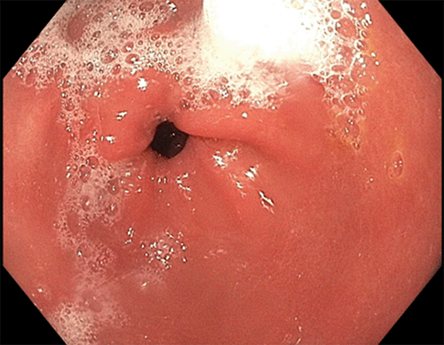 In the first case, the patient, a 37-year-old Caucasian male, presented with a one-year history of intermittent left upper quadrant abdominal pain. His past medical and surgical history was significant for obesity (BMI 39 kg/m2), hypertension, hyperlipidemia, Hashimoto’s thyroiditis, and inguinal hernia repair. He had a history of prolonged NSAID use but no history of smoking or significant alcohol consumption. His symptoms transiently improved with proton pump inhibitors (PPI) and antacids. He had a family history of gastric and colonic polyps in his father and bladder cancer in his paternal aunt. He had no family history of gastric cancer. Based on his symptoms, he was referred to gastroenterology. He underwent an esophagogastroduodenoscopy (EGD) that revealed multiple gastric polyps in the fundus and body of the stomach with antral sparing (Figure 1 and Figure 2), no polyps in the duodenum, and Los Angeles grade A reflux esophagitis. Biopsies were obtained and returned as fundic gland polyps without evidence of dysplasia on pathology. He underwent a colonoscopy that revealed small internal hemorrhoids and diverticula. No polyps were identified. His serum gastrin level was normal. The patient was referred for genetic counseling and testing and was found to have the c.-191T>C mutation in the APC promoter region seen in the setting of GAPPS. The patient had no known history of familial cancer syndrome. He had no evidence of metastatic disease on CT of the abdomen and pelvis.