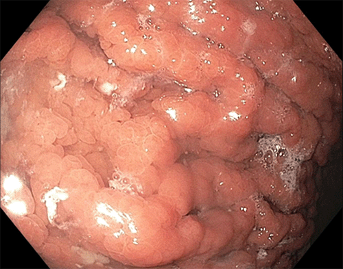 Figure 1. Gastric Body—Extensive Polyposis With Heterogenous Polyps. Published with Permission
