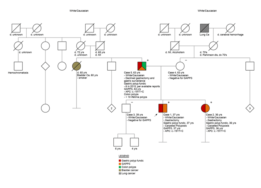 We have summarized two patients with GAPPS with pathognomonic features of the syndrome on endoscopic, histopathologic, and genetic evaluation. The patients were young, relatively healthy and despite having benign polyps on histology, were anxious about the risk of malignant transformation. They underwent prophylactic total gastrectomies with good postoperative outcomes. Genetic testing was offered to all their first-degree relatives (family of five): the father tested positive, the mother tested negative, and a brother was negative (Figure 5). The father described a remote history of gastric polyposis seen on a prior upper endoscopy but declined further workup or prophylactic surgery. While no guidelines for surveillance exist, following a multidisciplinary discussion, we opted for a six-month follow-up EGD and a one-year abdominopelvic CT scan for our patients.