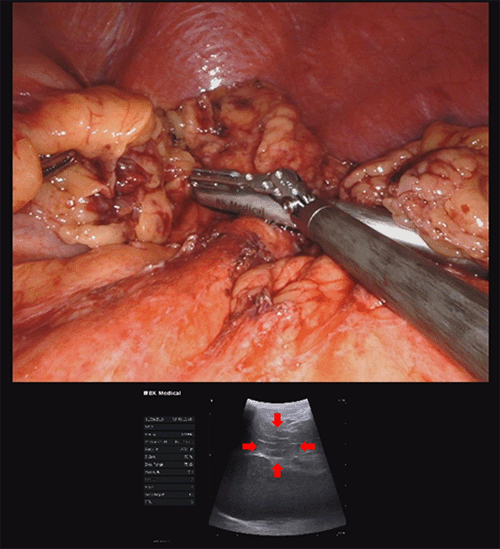 Figure 3. Robotic-Assisted Distal Pancreatectomy and Splenectomy with Intraoperative Ultrasound to Localize Pancreatic Lesion (Red Arrows) in Tail. Published with Permission
