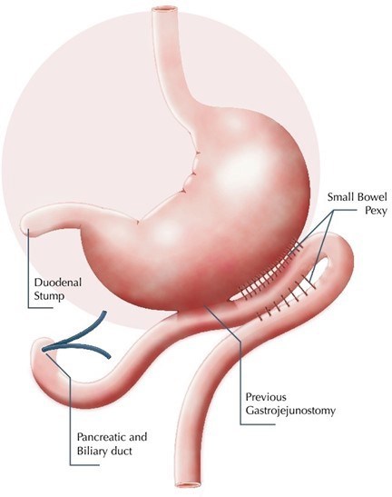 Endoscopic reduction has been described, but the risk of perforation or recurrence is high.13,14 Potential surgical options for intussusception depend largely upon intraoperative findings and intestinal viability. They include simple reduction with or without fixation and revision or resection with re anastomosis.8 Another potential option is to convert the gastrojejunostomy to Roux-en-Y configuration, mainly if nonviable intestine is encountered at exploration. In our case, the afferent limb was short in length because the index gastrojejunostomy had been constructed close to the duodenum, completely to the right of the midline. The limb was also partially tethered in the retroperitoneum from prior surgery. If a long afferent limb had been encountered, additional pexy of the afferent to the efferent limb, similar to a Braun jejujo-jejunostomy but without anastomosis, could have also been considered.