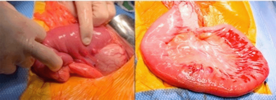 Jejunogastric intussusception (left) and post-reduction viable small bowel (right) are shown.