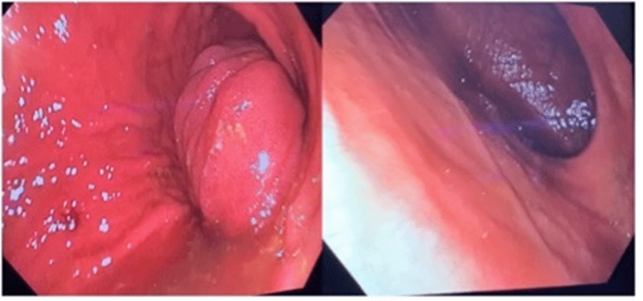 Since the patient was stable, consent was obtained for an initial upper endoscopy to further define and clarify anatomy, followed by laparotomy immediately thereafter. The operating surgeon had full anesthesia capabilities and performed the endoscopy in our surgical endoscopy unit. Upon passage of the scope into the distal gastric body, an intussuscepting limb of the small bowel was encountered, which was fully viable. Its origin was not initially apparent, and the scope could be maneuvered through the patient’s native pylorus into a large blind pouch of proximal duodenum with no outlet. There was no bile in the stomach or this blind ending pouch (Figure 3). A laparotomy followed, and examination of the abdominal content revealed the colon to indeed be on the left side of the abdomen. The appendix was surgically absent, consistent with prior Ladd’s procedure. There was complete atresia of the second portion of the duodenum. A surgical gastrojejunostomy was noted, the efferent limb of which had intussuscepted retrograde through the gastrojejunal anastomosis into the gastric lumen. The intussusception was manually reduced by grasping the stomach at the cephalad aspect of the intussusception and pushing the jejunum within its lumen distally back toward the anastomosis while placing only minimal traction on the intussuscepted jejunal limb from below. Once fully reduced, there was no evidence of a lead point, and jejunal viability was confirmed (Figure 4).