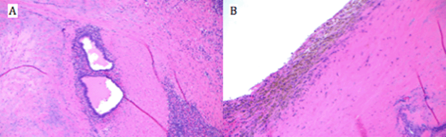 A) Hematoxylin and eosin (H&E) stained section at 100x magnification showing splenic cyst wall with rare endometrial-type glands with tubal metaplasia; B) H&E stained section at 100x magnification showing splenic cyst wall with fibrosis and focal collections of hemosiderin-laden macrophages.