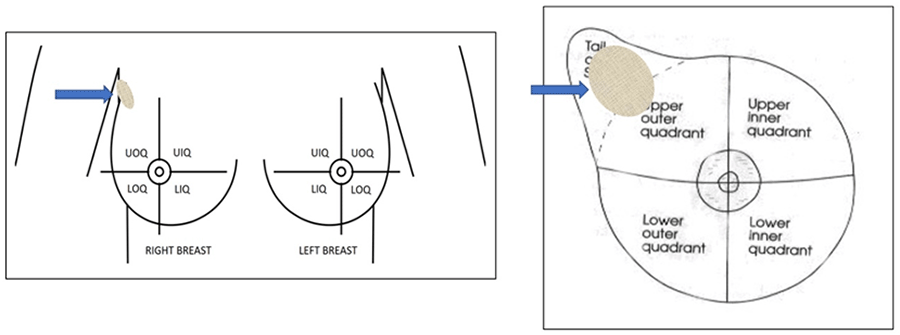 A 31-year-old female presented with complaints of lumpiness in the outer aspect of the right breast ongoing for one year, which was also associated with moderate-intensity cyclical pain for the past six months. She had no history of breast or axillary lumps or nipple discharge. She was multiparous with two children who were breastfed cumulatively for five years. Her family history was negative for breast or ovarian cancer. Examination of the right breast showed an area of clustered nodularity measuring around 4 × 4 cm from the 9 to 11 o’clock position in the UOQ near the axillary tail (Figure 1). The remaining right breast, contralateral breast, and bilateral axillae were normal.