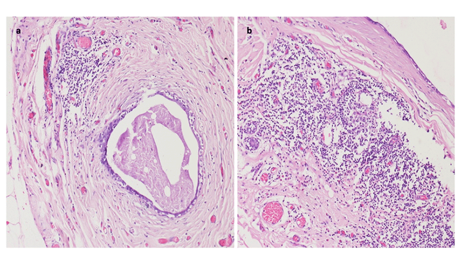 Histopathological evaluation of the surgical specimen revealed multiple dilated ducts filled with cheesy material reaching up to the skin. The epithelium of a few ducts was ulcerated. There was periductal chronic inflammation, and duct ectasia was diagnosed with periductal mastitis (Figure 3). All the excised margins were free.