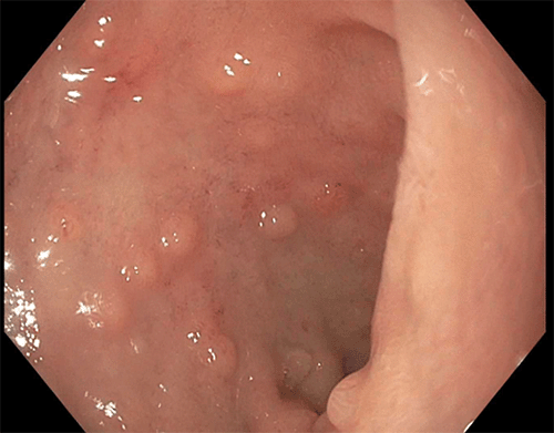 Figure 2. Follow-Up EGD Visualizing Second Part of Duodenum With Many Sub-Centimeter Nodules. Published With Permission