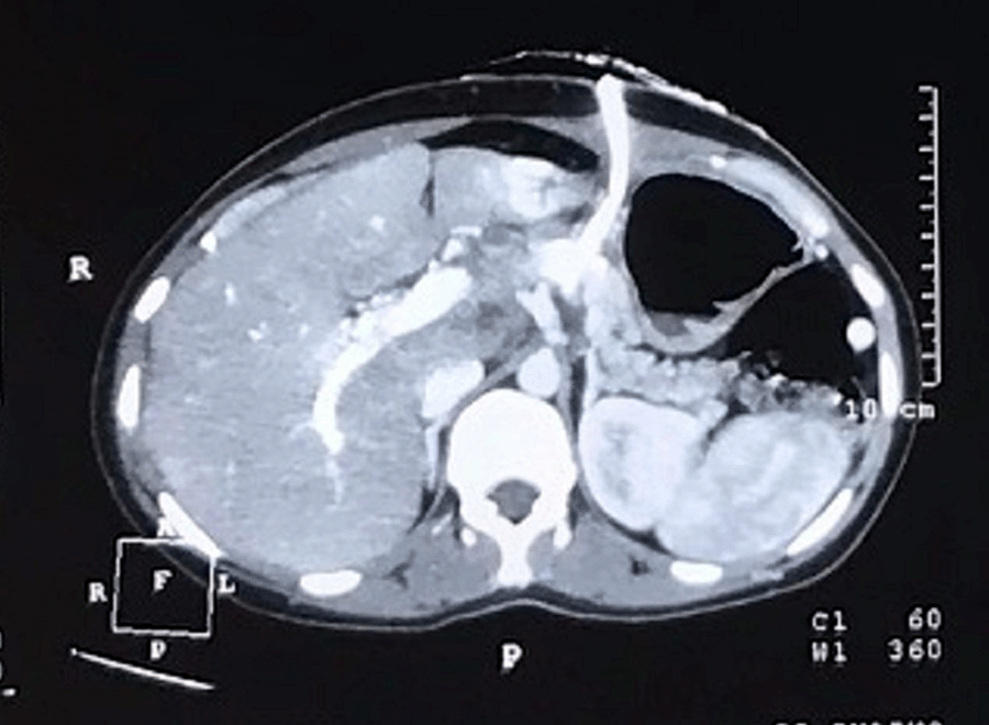 Figure 1. CECT Scan Axial Cuts Showing Large Cystic Lesion in Pancreatic Neck and Body. Published With Permission