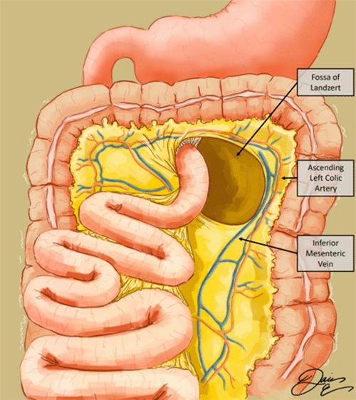 Figure 2. Fossa of Landzert with Inferior Mesenteric Vein and Ascending Left Colic Artery Running Along Lateral Free Edge. Published with Permission