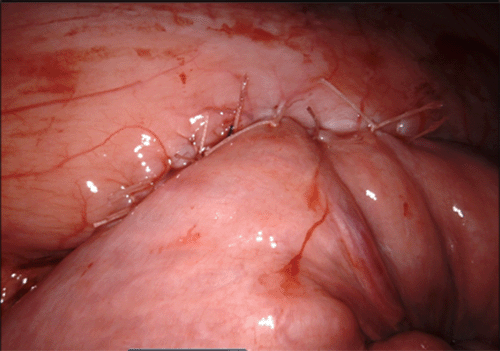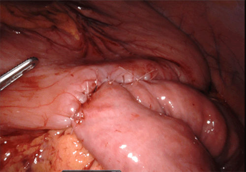 The terminal defect was closed with a running 3-0 absorbable V-loc suture maintaining bowel patency throughout (Figure 7).