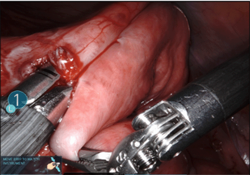 Figure 6. Robotic GIA 45 Stapler Using Blue Load Advanced into Stomach and Jejunal Limb to Create Gastrojejunostomy. Published with Permission