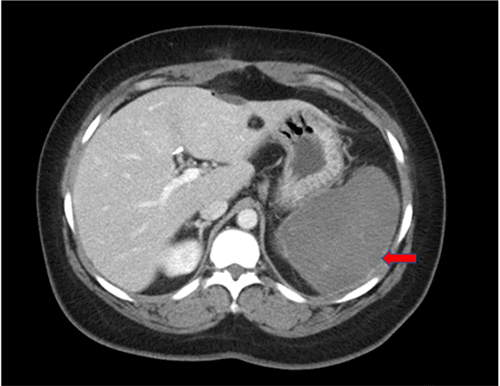 Figure 1. CT of Abdomen with Oral and Intravenous Contrast Showing Splenomegaly, Splenic Artery Thrombosis, and Global Splenic Infarction. Published with Permission