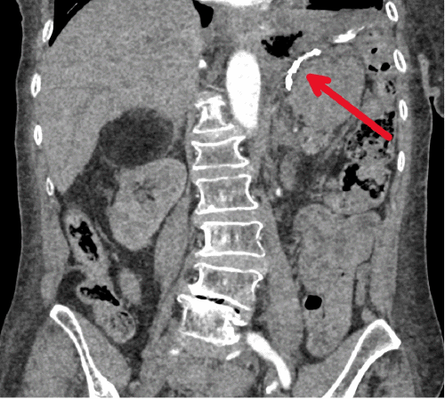 Figure 1. Coronal CT Scan Revealing Hyperdense Material Located in Gastric Remnant. Published with Permission