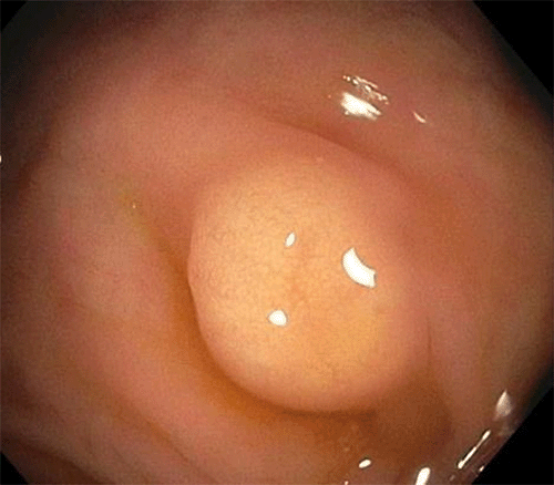 Figure 1. Solitary Submucosal Lesion in Cecum Seen on Colonoscopy. Published with Permission