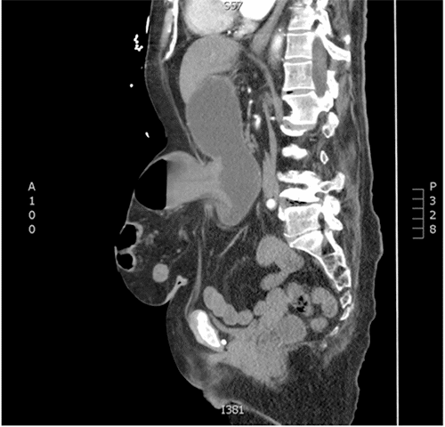 Figure 1. CT Scan Showing Large Ventral Hernia Containing Pylorus and Bowel. Published with Permission