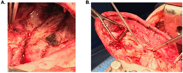 Figure 3. Intraoperative Visualization of A) Colobronchial Fistulous Tract and B) Involved Left Lower Lobe Bronchus (denoted by probe) After Left Thoracotomy. Published with Permission