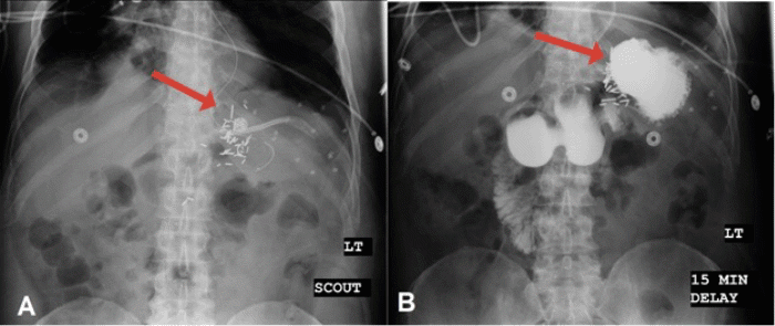 Figure 4. Upper GI X Ray Demonstrating Stomach Projecting Under Diaphragm A) Before and B) After Contrast. Published with Permission