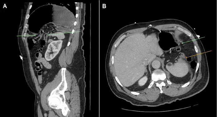 Figure 2. Abdominopelvic CT with Contrast Demonstrating Hiatal Hernia Containing Splenic Flexure and Stomach in A) Sagittal Section and B) Axial Section. Published with Permission