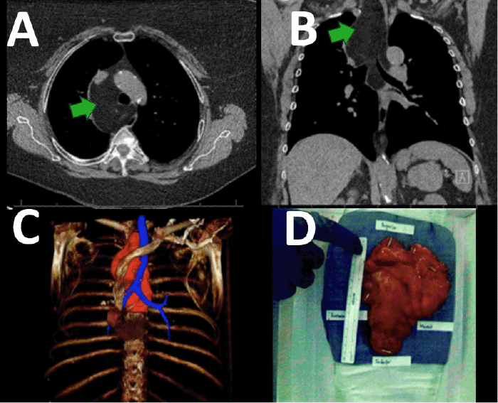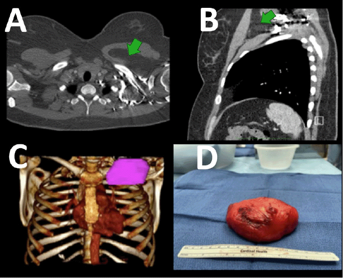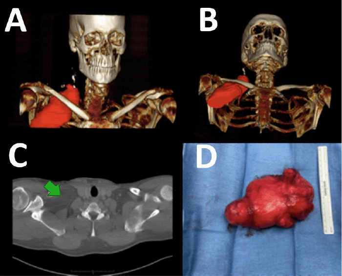 Figure 1. (A and B) 3D Reconstruction (mass in red), C) Axial CT Scan (green arrow denotes mass), and D) Resected Lipoma. Published with Permission
