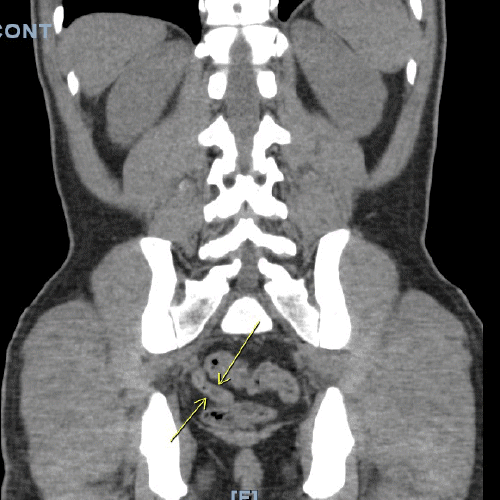 Figure 1. CT Scan: Tip Appendicitis in Pelvis. Published with Permission