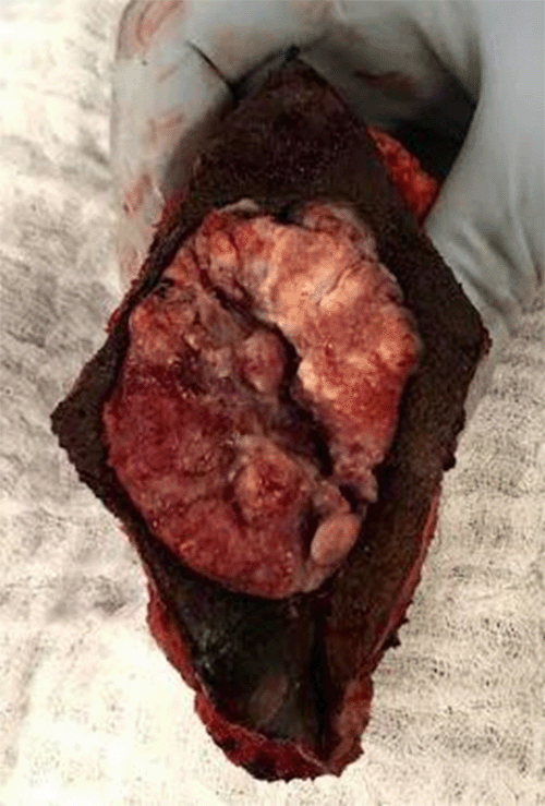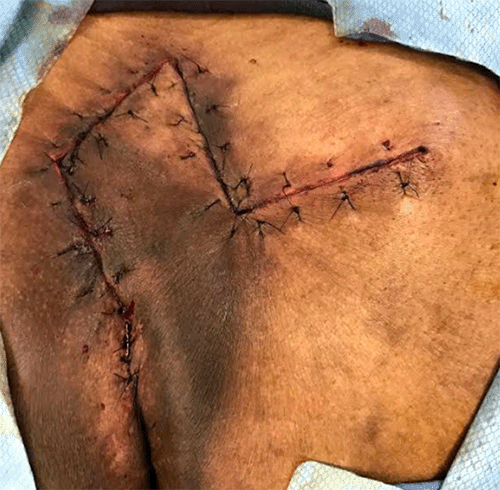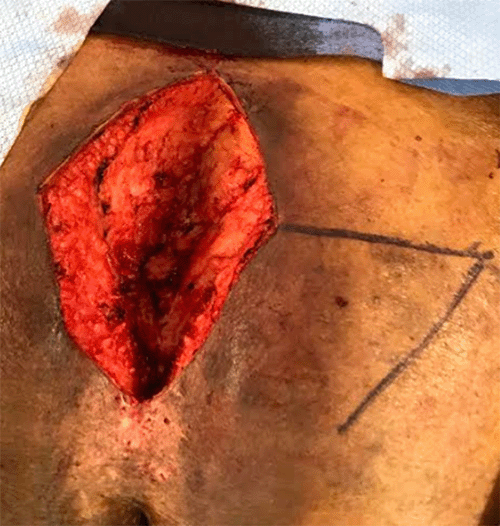 With no metastatic disease, wide local excision of this mass was recommended. He was positioned prone jackknife. Excision and reconstruction were carefully planned and marked on the skin. The vertical extent of the mass was about 6 cm, with pitting pilonidal sinuses extending inferiorly. Therefore, a 13 × 8 cm diamond-shaped incision was made to remove the mass along with all pitting disease down to the gluteal and presacral fascia. The gluteal fascia was left for reconstruction, while the presacral fascia was taken with the specimen as a deep margin. The resultant significant soft tissue defect was reconstructed with an 8 × 8 cm rotational rhomboidal skin flap was used for reconstruction (Figure 3). Gluteal fascia was elevated off the underlying muscle and secured to the contralateral fascial edge for a deep layer of sutures. A drain was placed under the fascial closure.