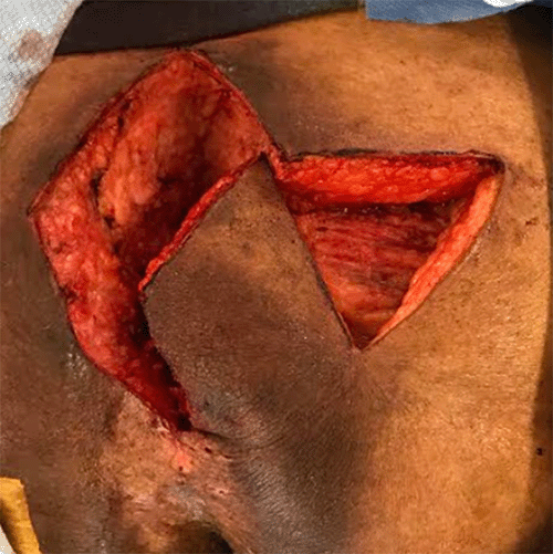 The final pathology showed a 5.5 cm well-differentiated squamous cell carcinoma (SCC) with negative margins and a depth of invasion of 0.8 cm (pathologic T2Nx). Following surgery, the patient recovered smoothly. However, he developed superficial wound dehiscence at the apex of his rotational flap, which was managed with negative pressure therapy for about eight weeks. His wound healed completely without any signs of local recurrence (Figure 4).
