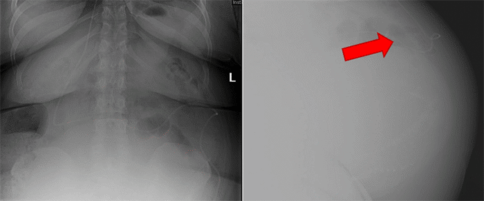 Ventriculoperitoneal (VP) shunts are a well-established neurosurgical procedure generally performed to treat hydrocephalus, among other indications. These ventricular-based shunts can serve as a conduit from the brain to a distal compartment, such as the pleura, atrium, and, most commonly, the peritoneum.1 Although common, a variety of complications have been described. A rare intraabdominal complication described is VP shunt-associated bowel perforation.2,3 Perforation can occur weeks to years after device placement. Many patients are asymptomatic. However, a missed diagnosis can have life-threatening consequences like sepsis, meningitis, or even death.2,3 Due to the limited data on managing this complication, treatment is tailored to the individual's clinical presentation. This can range from non-surgical approaches like manual or endoscopic removal to surgical interventions using laparoscopic or open techniques.4