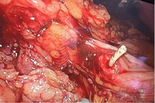 A two-stage procedure was performed on the patient for VP shunt revision. The first stage involved externalizing the proximal end of the shunt at the right chest wall. Laparoscopic access was then obtained through ports placed in the right and left anterior axillary lines, as well as the left and right periumbilical regions. Upon visualization, significant inflammation and dense adhesions were found around the VP shunt's entry point into the peritoneal cavity. These adhesions were taken down to allow for exposure of the shunt entrance. The intra-abdominal portion of the shunt was then divided, with the proximal segment pulled back into the abdomen. Further exploration revealed the VP shunt entering the transverse colon, as documented in Figure 4. Subsequently, the extracolonic portion of the shunt was divided and removed. This resulted in a clean-based 1 cm hole in the transverse colon with good vascularity. The colotomy was then laparoscopically closed in a figure-of-eight pattern using 3-0 Vicryl suture. To reinforce the repair, a modified Graham patch was created using omentum secured with 3-0 silk sutures over the closed colotomy site. Finally, a 19 French Blake drain was placed and secured over the transverse colon before being externalized through the left lateral port site.
