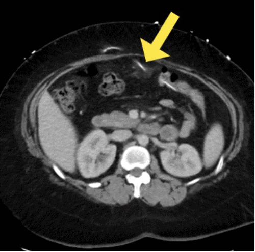 Figure 3. Axial CT Scan of Abdomen Demonstrating Protrusion of VP Catheter Through Transverse Colon. Published with Permission