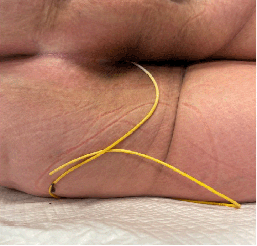 Figure 2. Anal Protrusion of VP Shunt Catheter. Published with Permission
