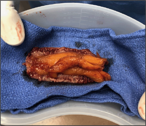 Figure 2. Resected and Exposed Section of Terminal Ileum Containing Whole, Dried Mango Slices. Published with Permission
