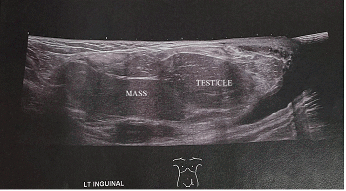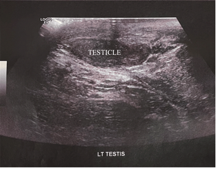Figure 1. Scrotal Ultrasound of Testicular Mass (left inguinal view). Published with Permission.