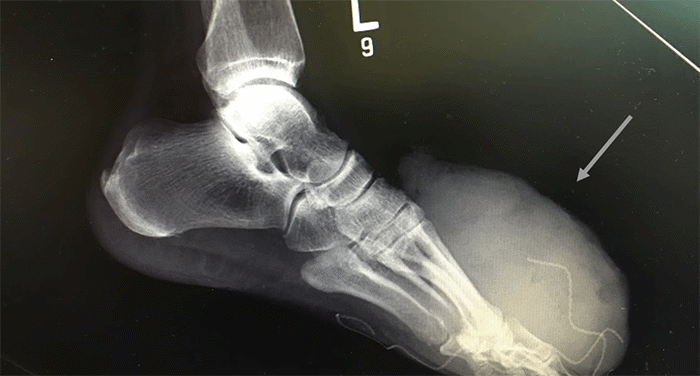 Figure 1. Preoperative Left Foot Radiograph Demonstrates Synovial Sarcoma (approximately 20 × 15 cm). Published with Permission