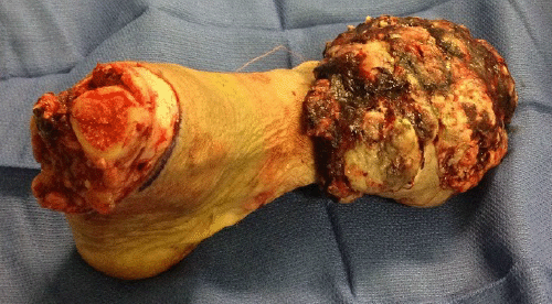 Despite the severity of the patient's status upon first arrived in the emergency room, he fared well. This was largely due to the rapid recognition that the patient required emergent guillitine amputation of the mass. After stabilization, the patient underwent a successful Gritti-Stokes amputation, with negative margins. Shortly after his definitive procedure, the patient was transferred to an acute rehab setting for an uneventful recovery and fitted with a sliding joint prosthesis and begun ambulatory training.
