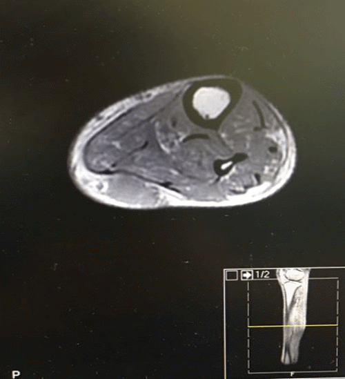 Further workup revealedan additional soft tissue mass that measured 3.5 × 2.5 and was located in the left posterior calf cm. As a result of the preliminary pathological diagnosis of the original mass, which indicated it to be a highly malignant tumor, the new finding required further workup. Once the patient stabilized, an MRI of the left lower extremity was performed. These images revealed no evidence of osteomyelitis but did identify a 3.5 × 1.7 × 2.5 cm subcutaneous cystic structure in the left posterior calf (Figure 3).
