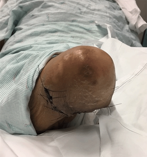 The patient underwent a metastatic work up consisting of CT head, chest, abdomen and pelvis, all of which negative for distant metastases. Following negative metastatic work up, the patient underwent a completion of left lower extremity amputation via successful Gritti Stokes amputation (Figure 4) with concurrent groin sentinel lymph nodes biopsy for tumor staging.